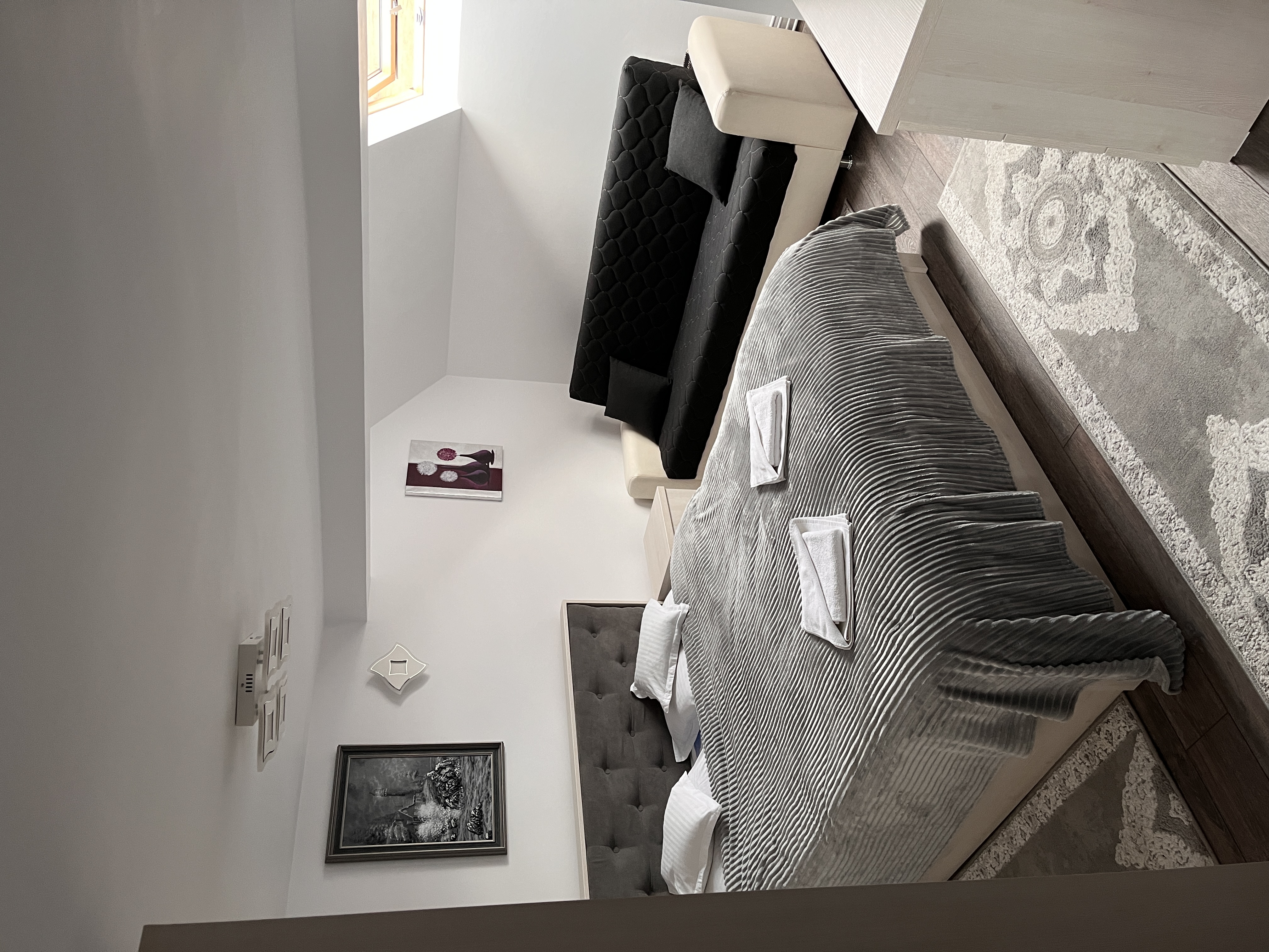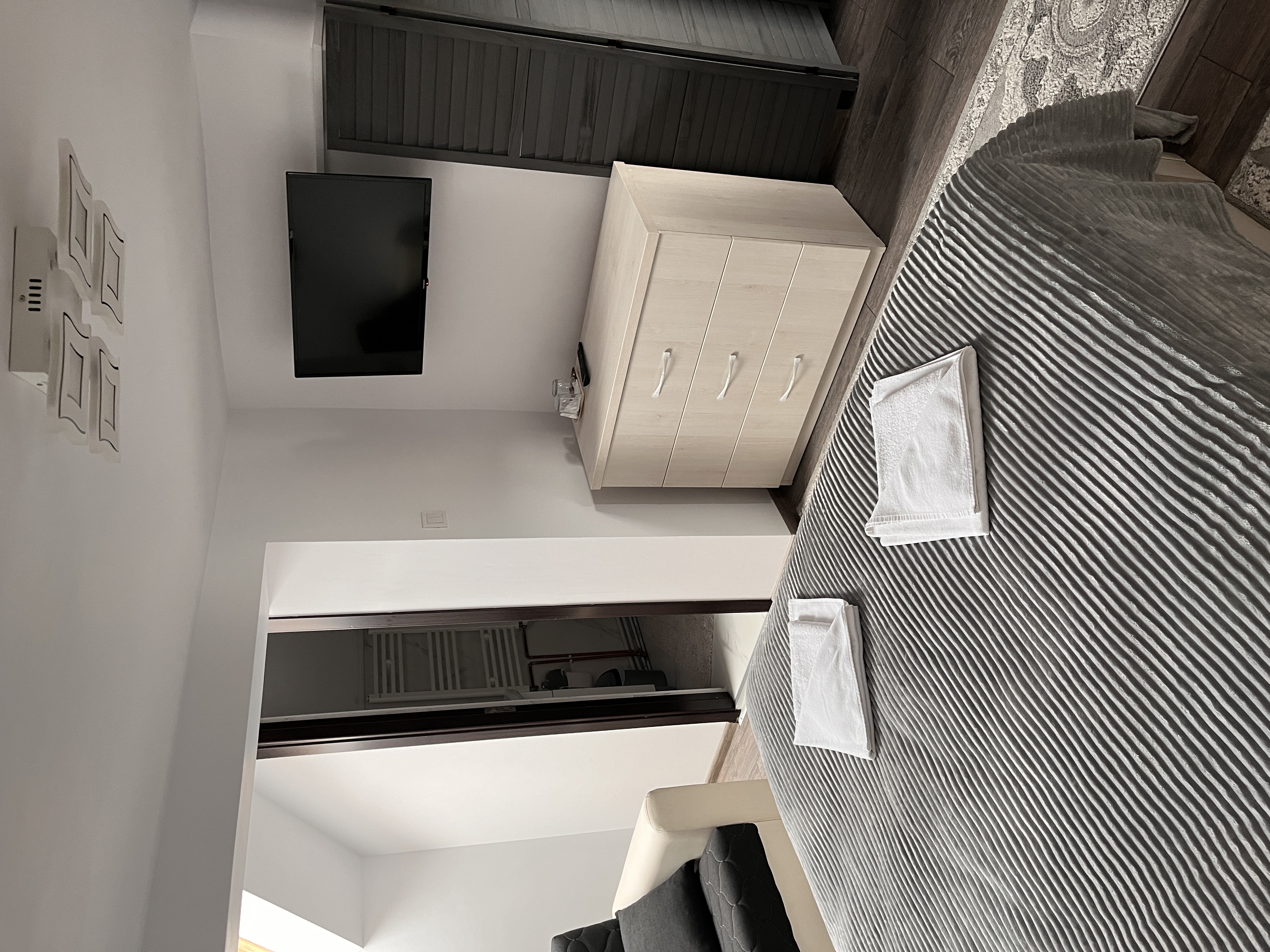Cameră elegantă cu baie privată, pat dublu și spațiu de lucru. Ideală pentru șederi lungi sau pentru cei care lucrează remote.